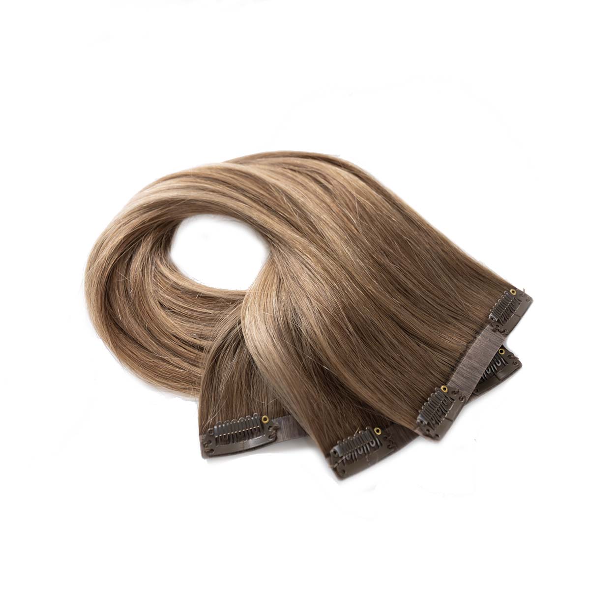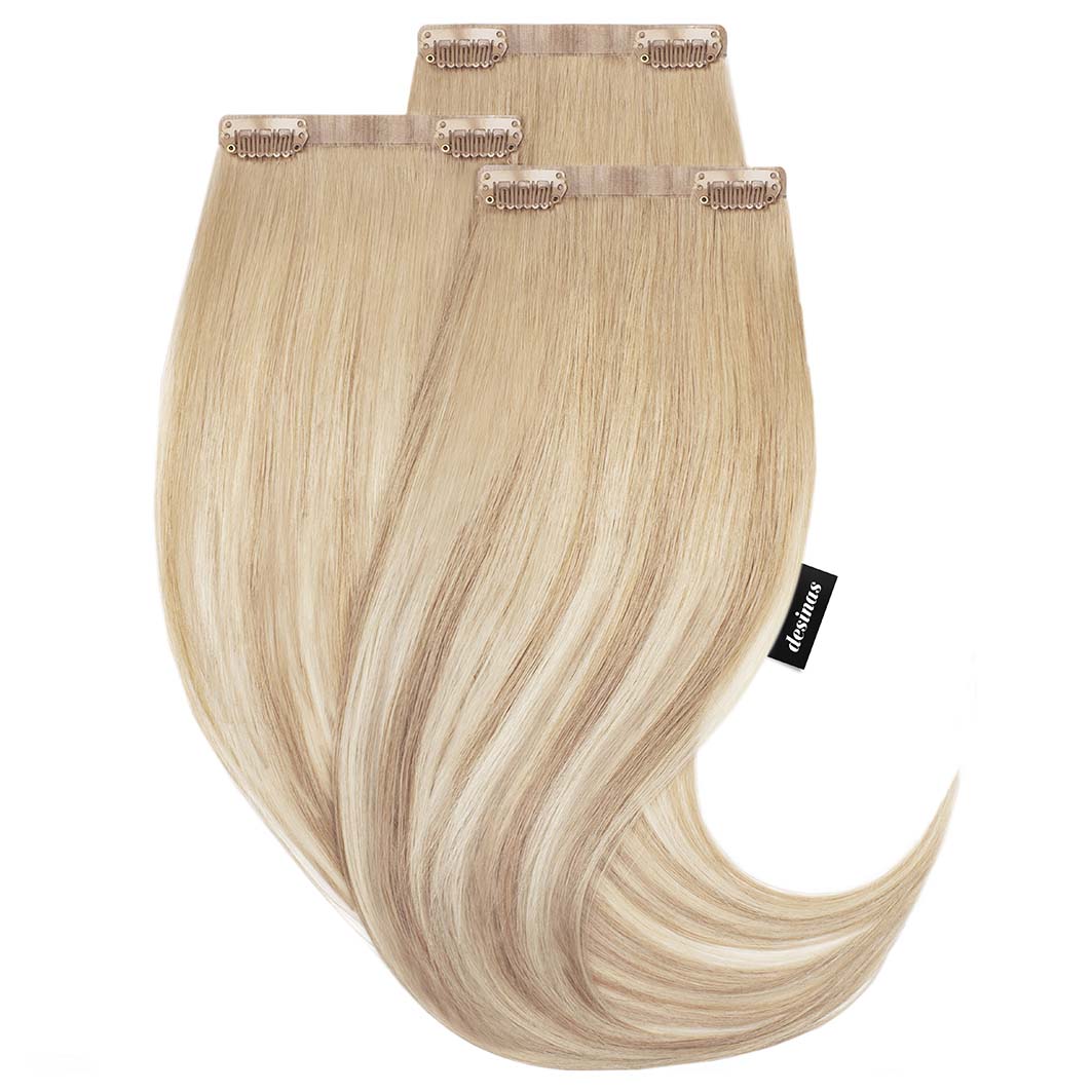 Das Seamless Clip In Extensions Set von Desinas lässt sich durch das ultraflache Silikonband völlig unauffällig im eigenen Haar verblenden. Die Extensions liegen wie bei einer dauerhaften Haarverlängerung mit Tape Extensions nah am Kopf an und tragen nicht auf.